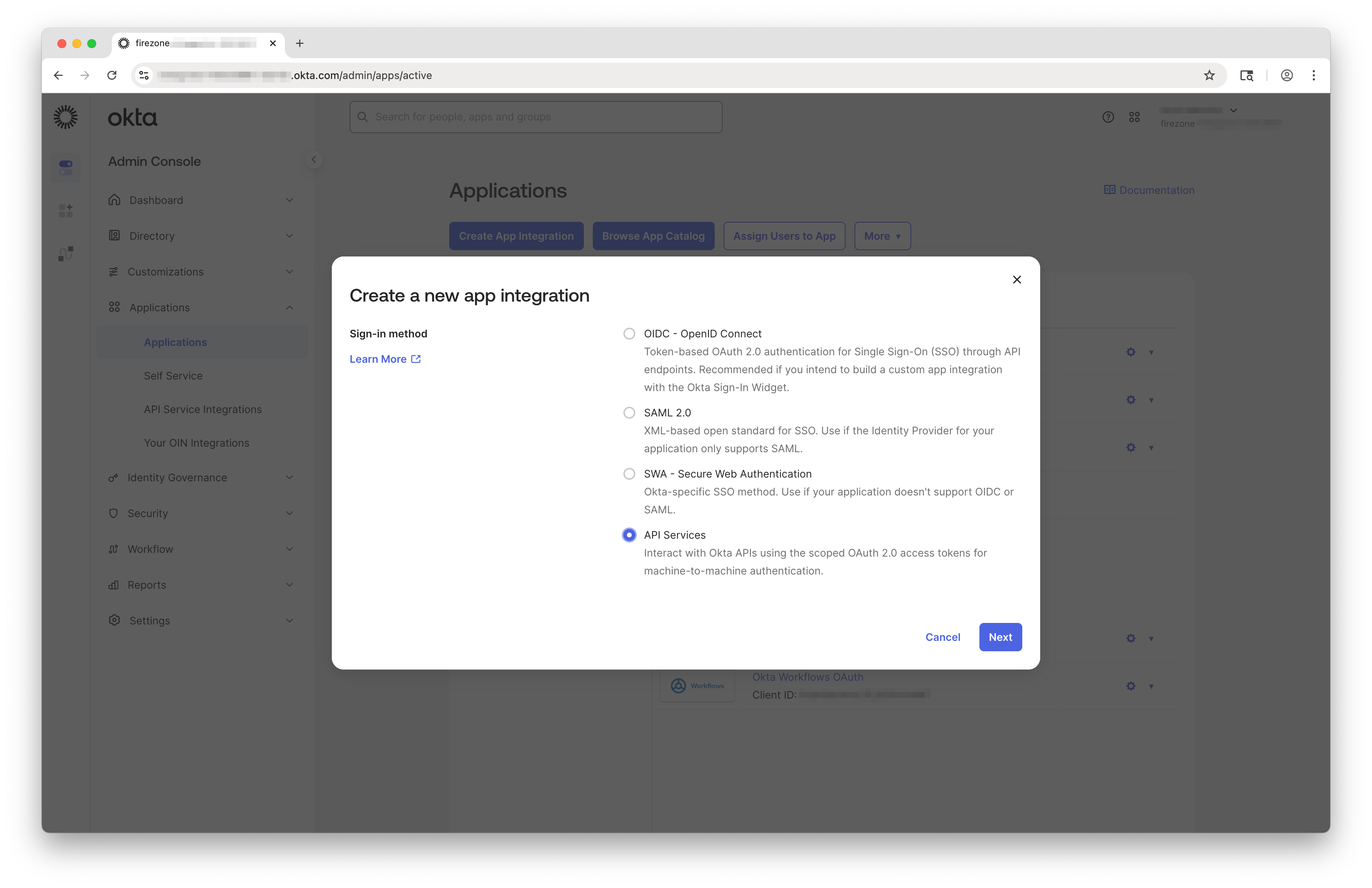 To enable directory sync, you'll create an API service app in Okta that allows Firezone to connect to the Okta APIs with read-only access to users, groups, and applications.