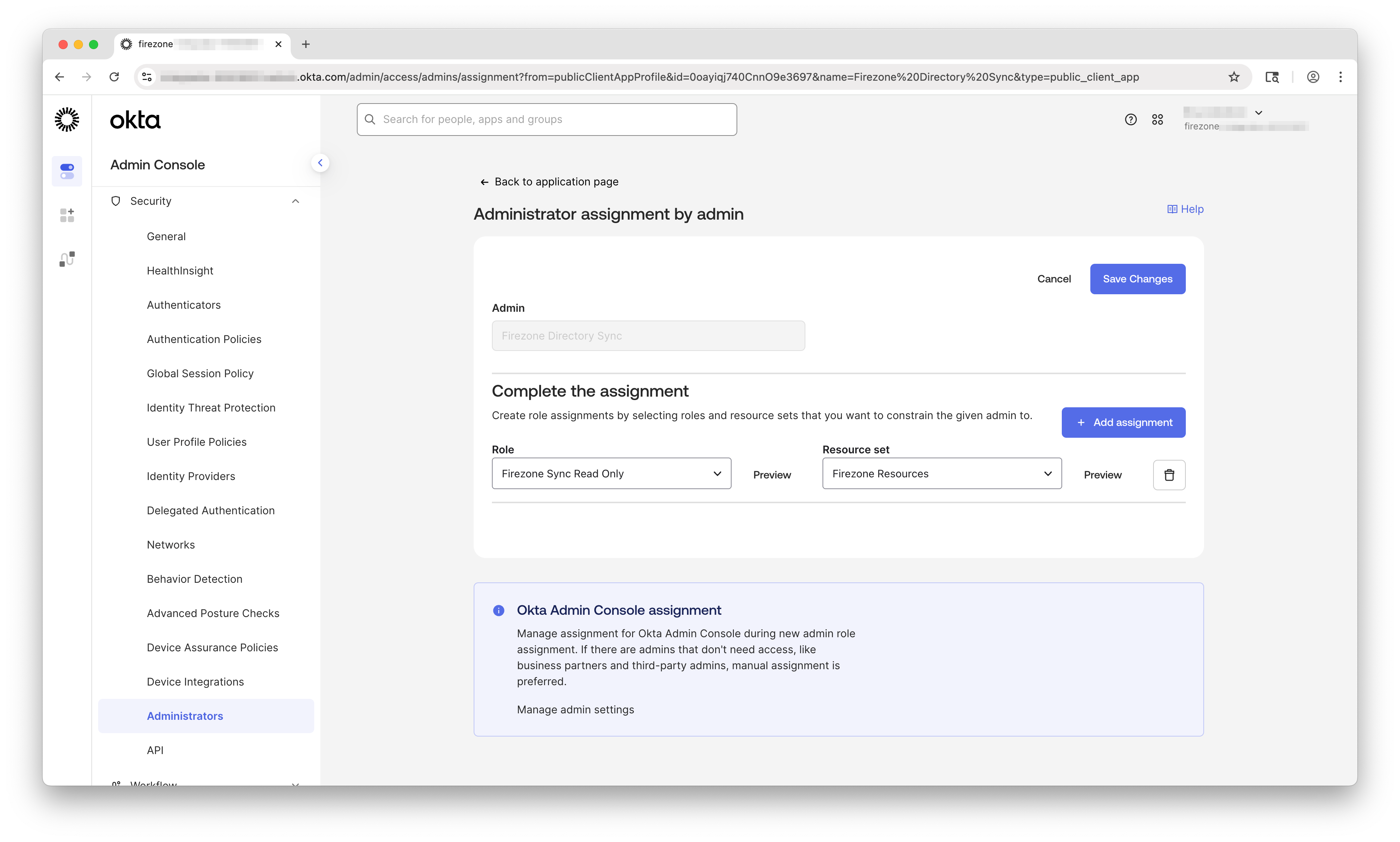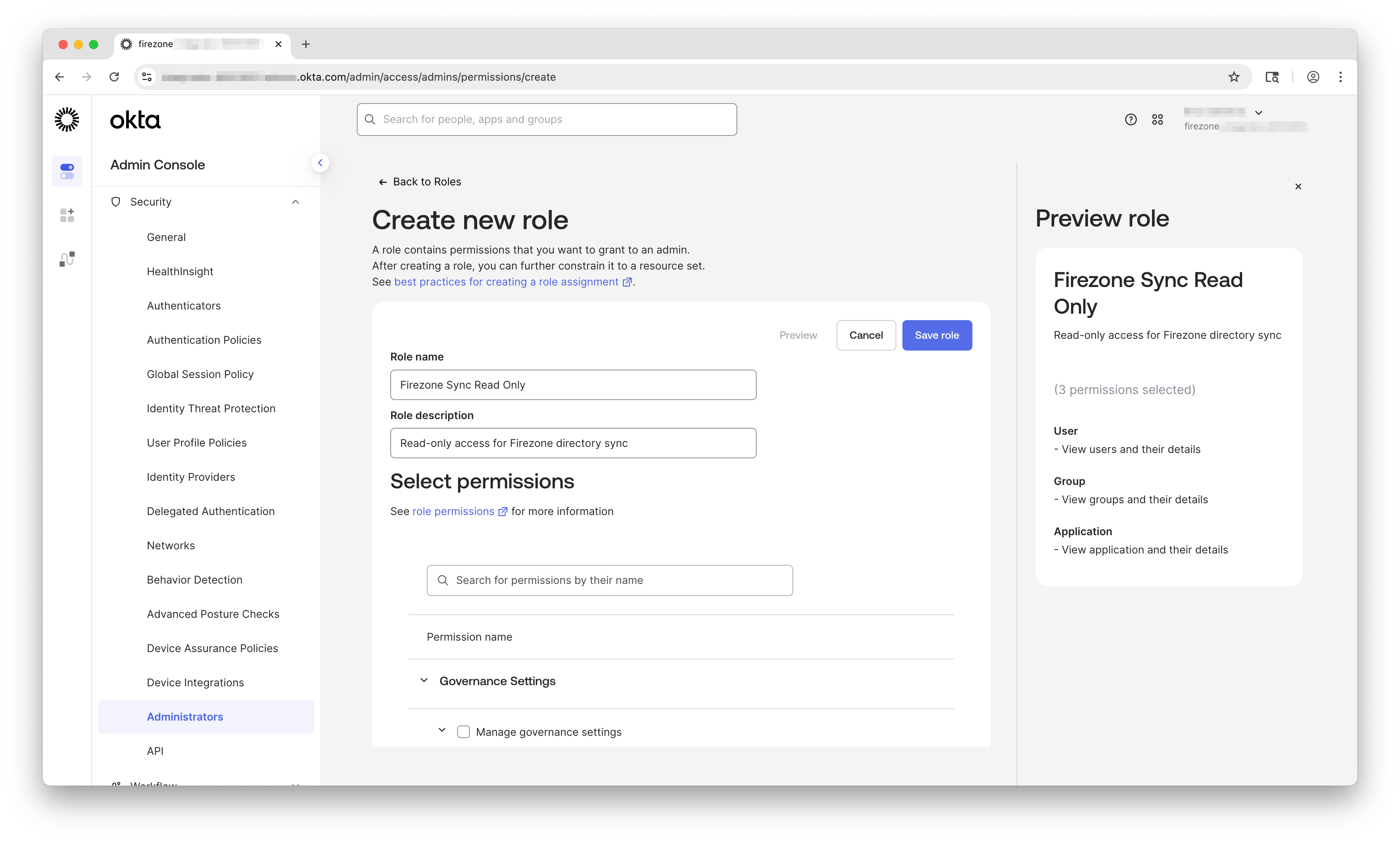 To ensure Firezone has only the minimum required permissions, you'll create a custom role in Okta with read-only access to users, groups, and a specific set of applications.