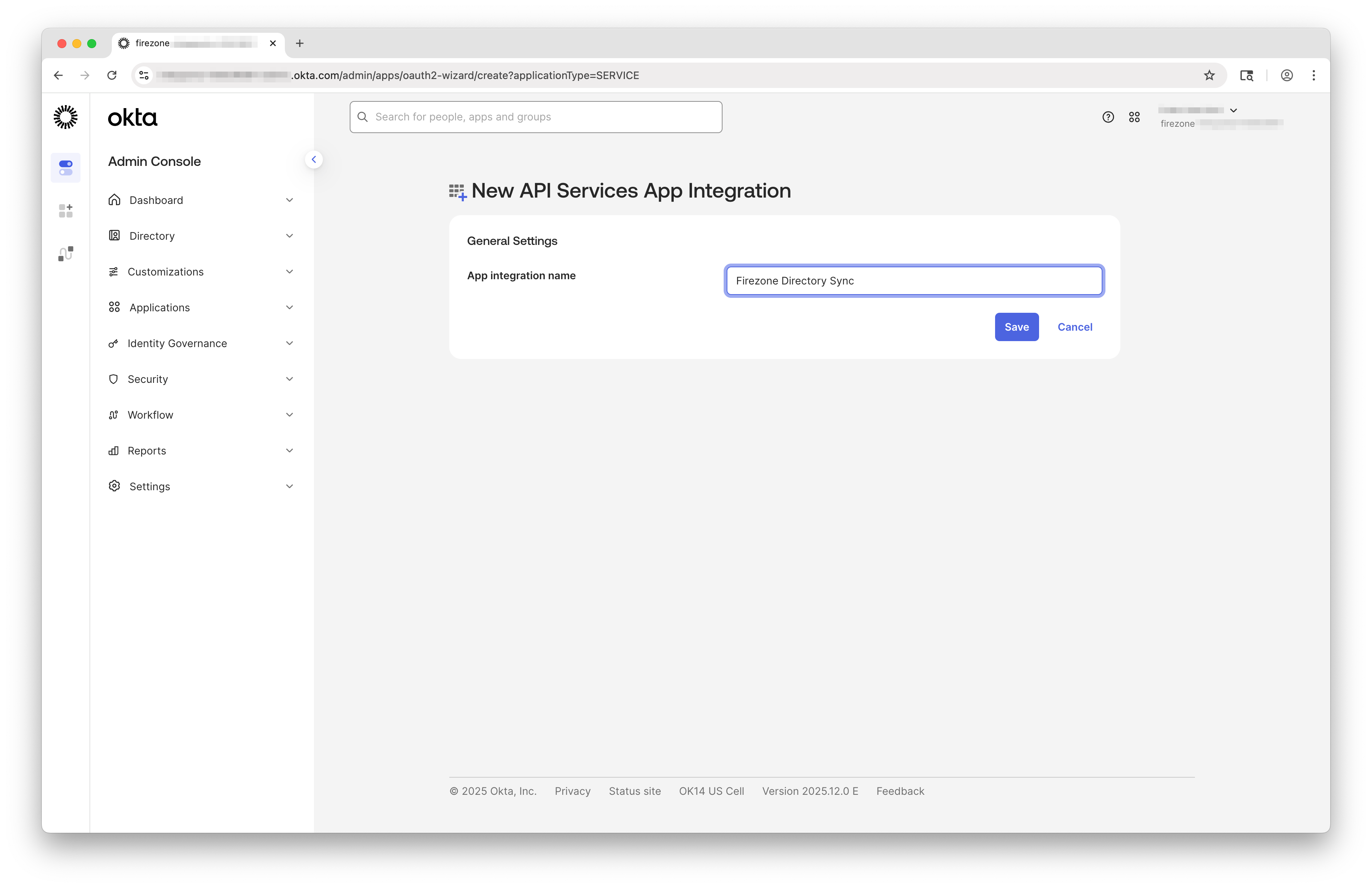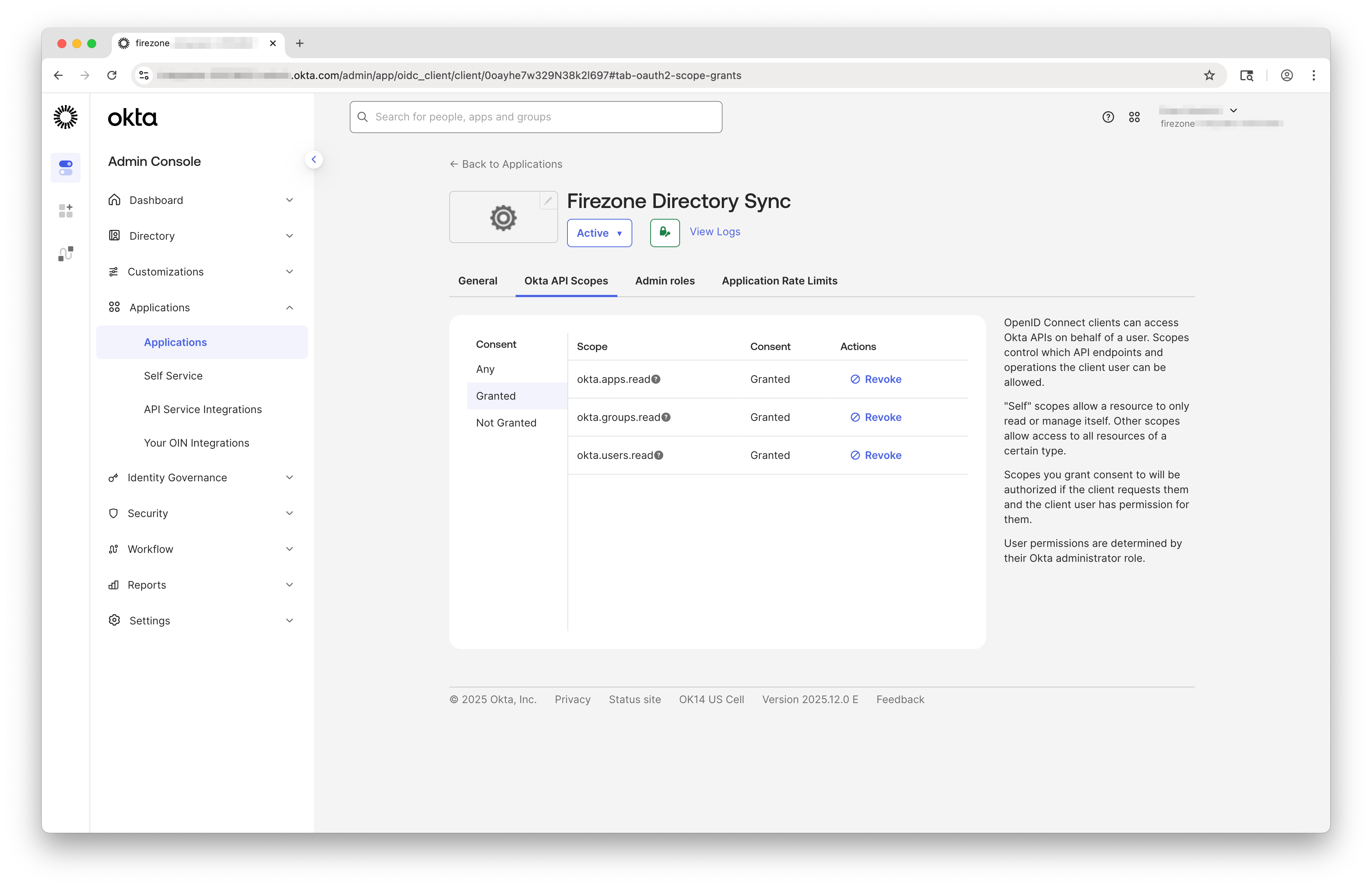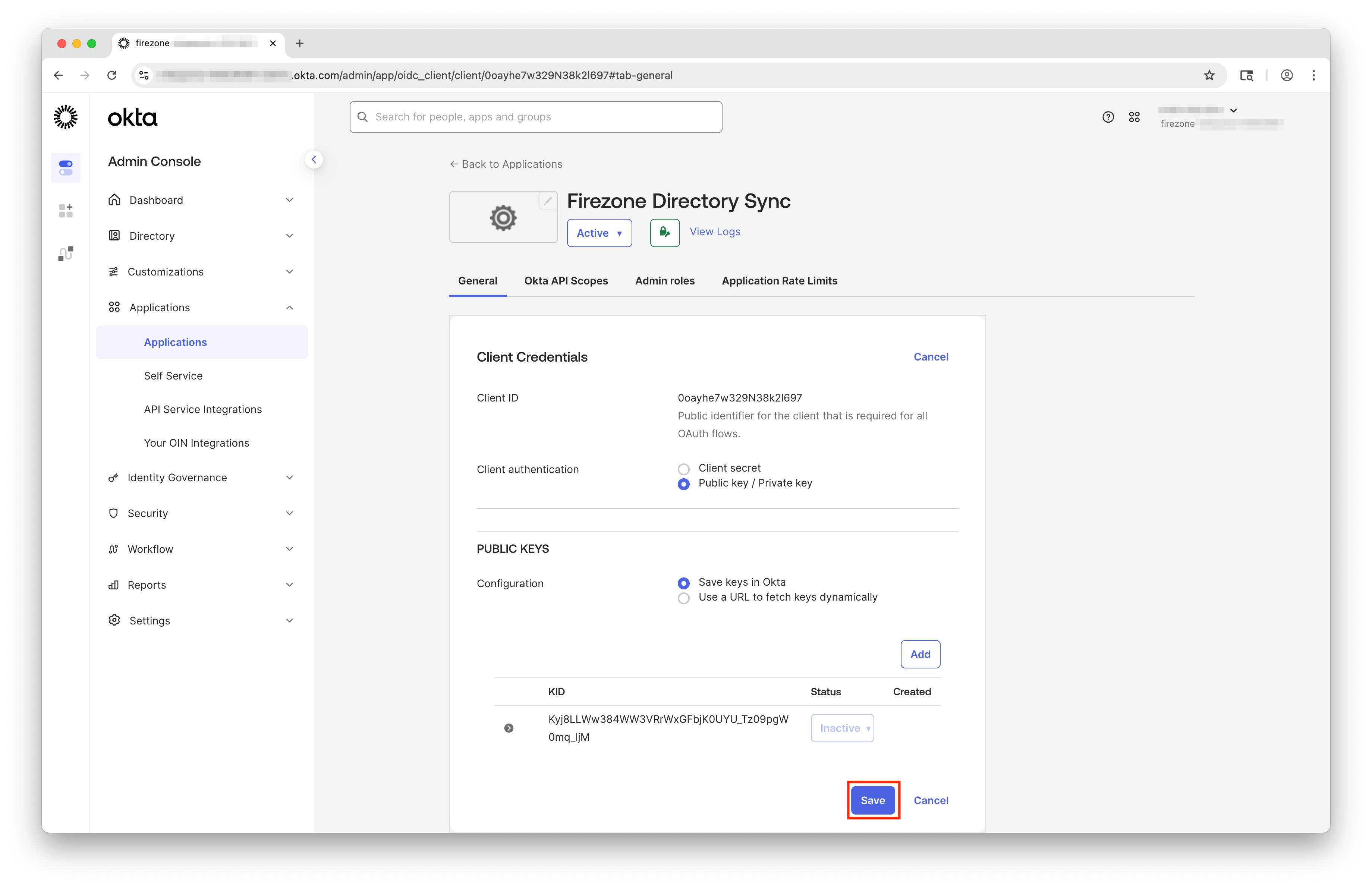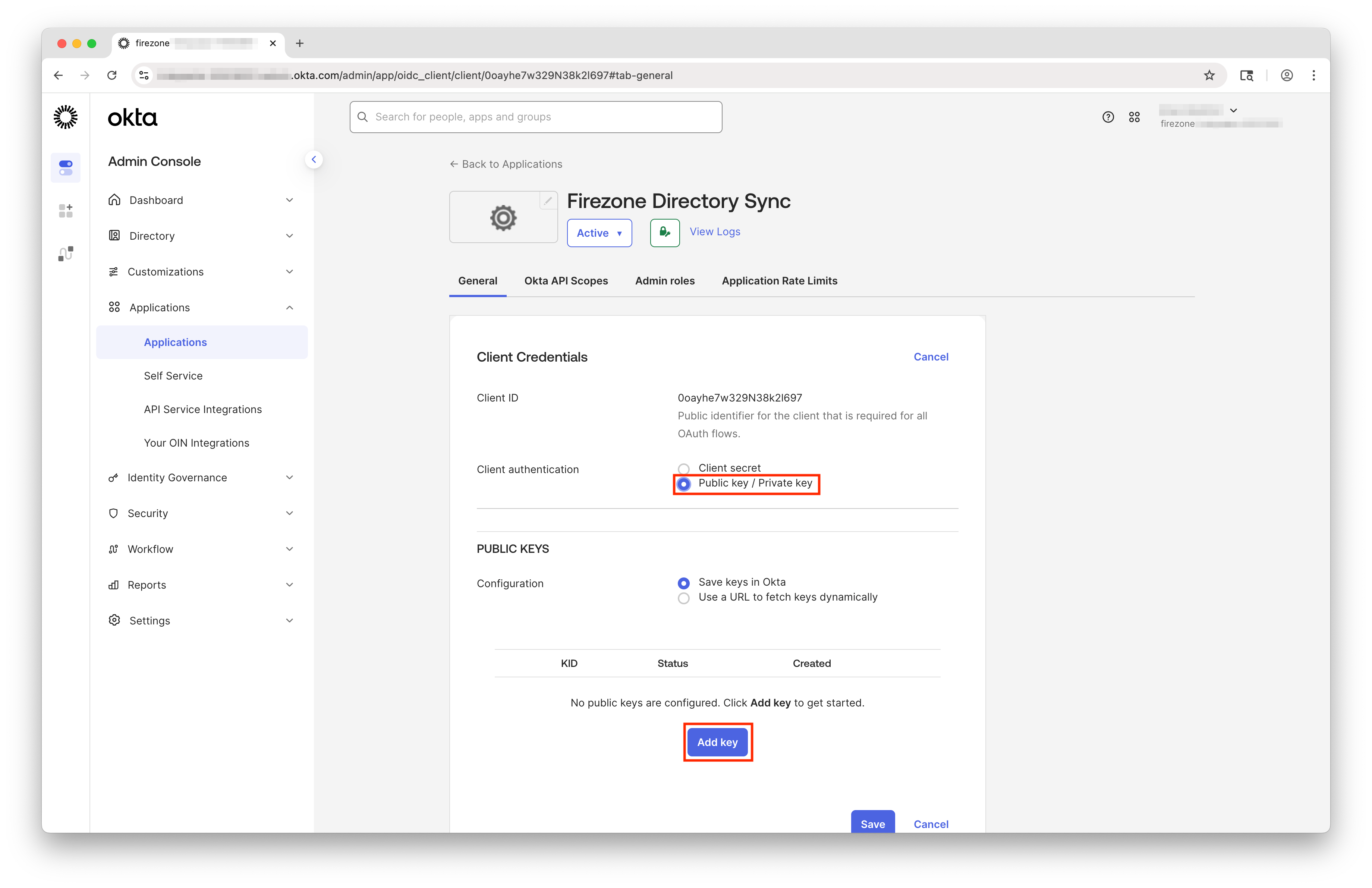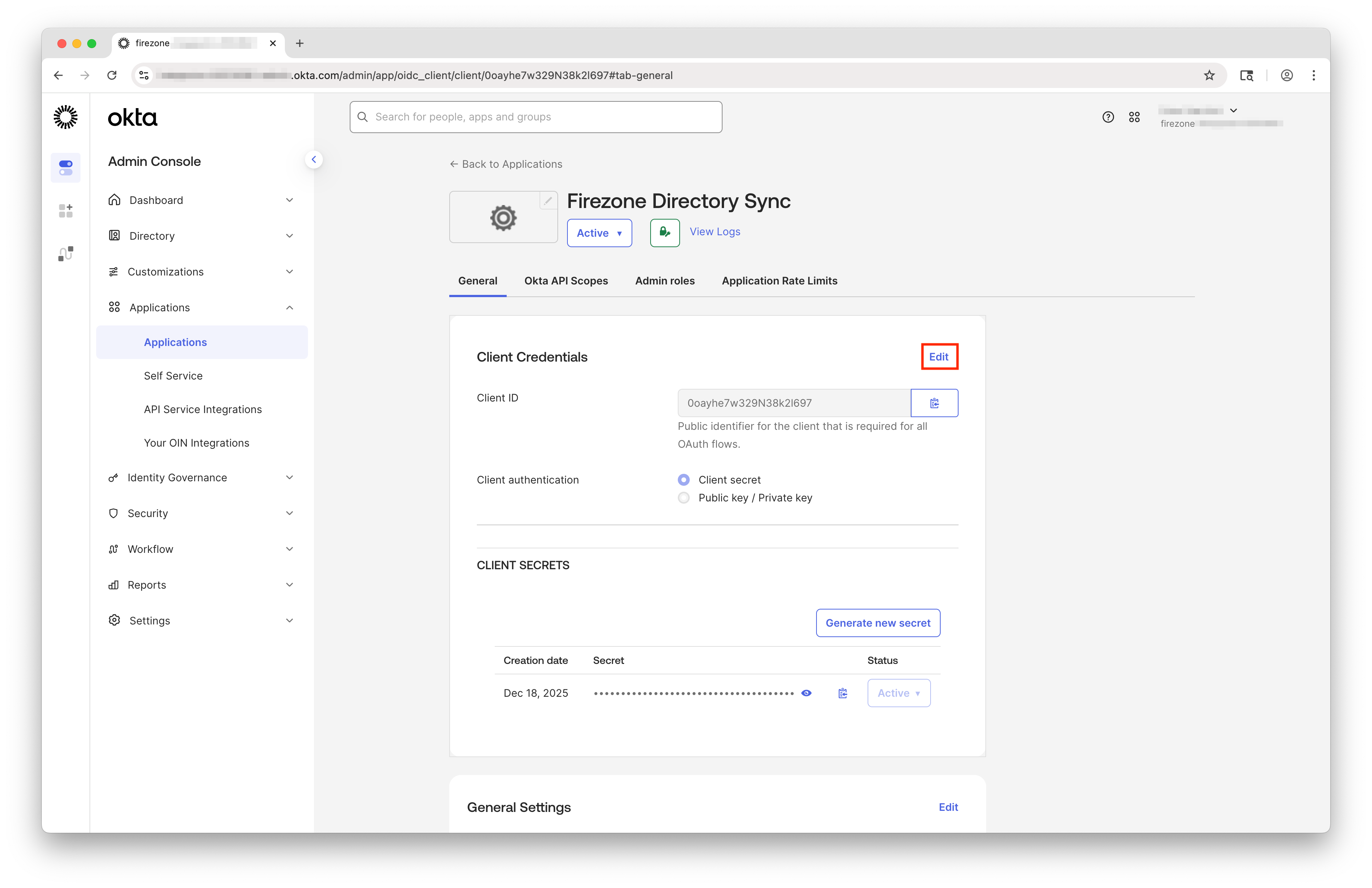 your-company.okta.com) - Client ID: Found on the General tab of your Firezone Directory Sync API service app in Okta