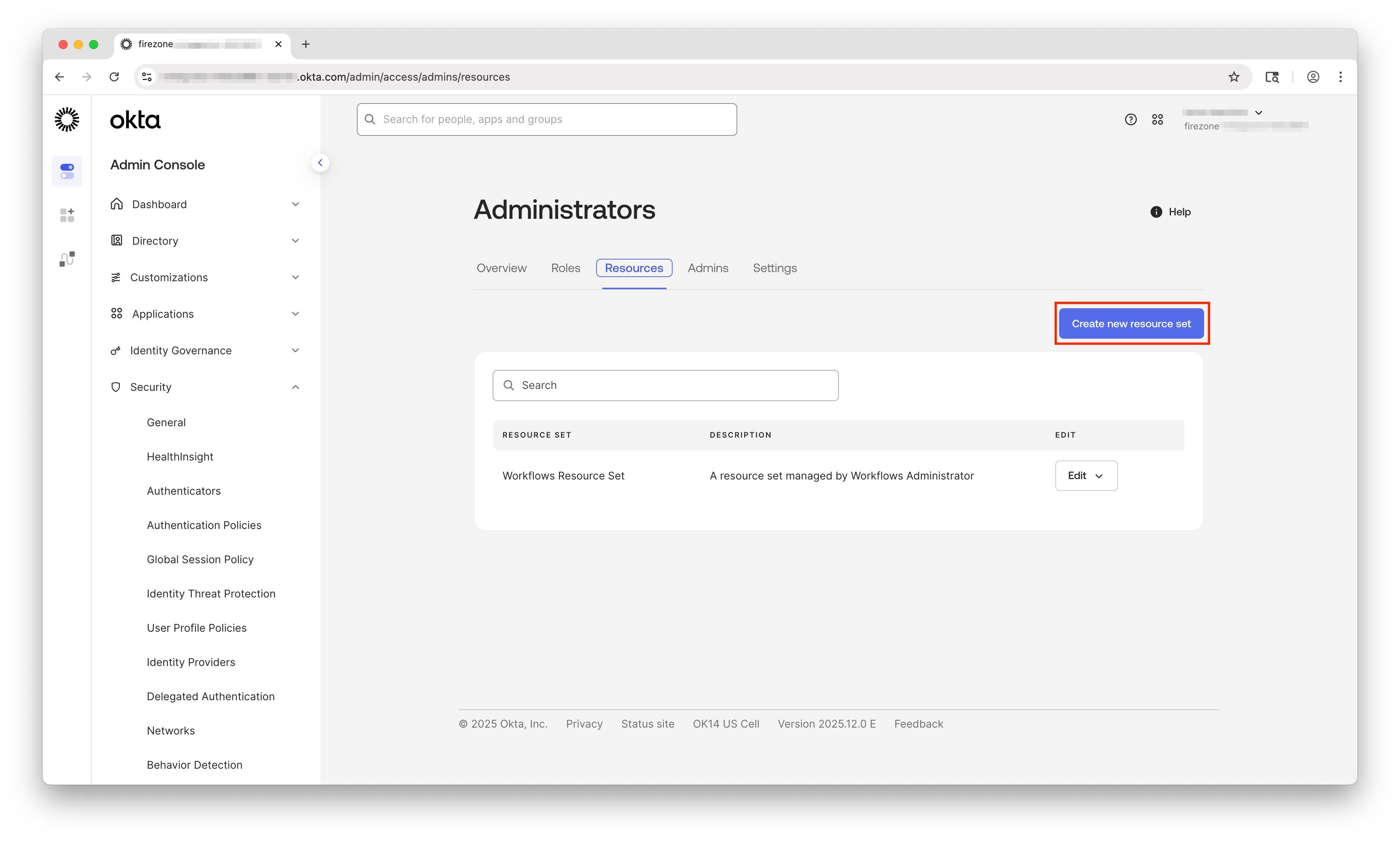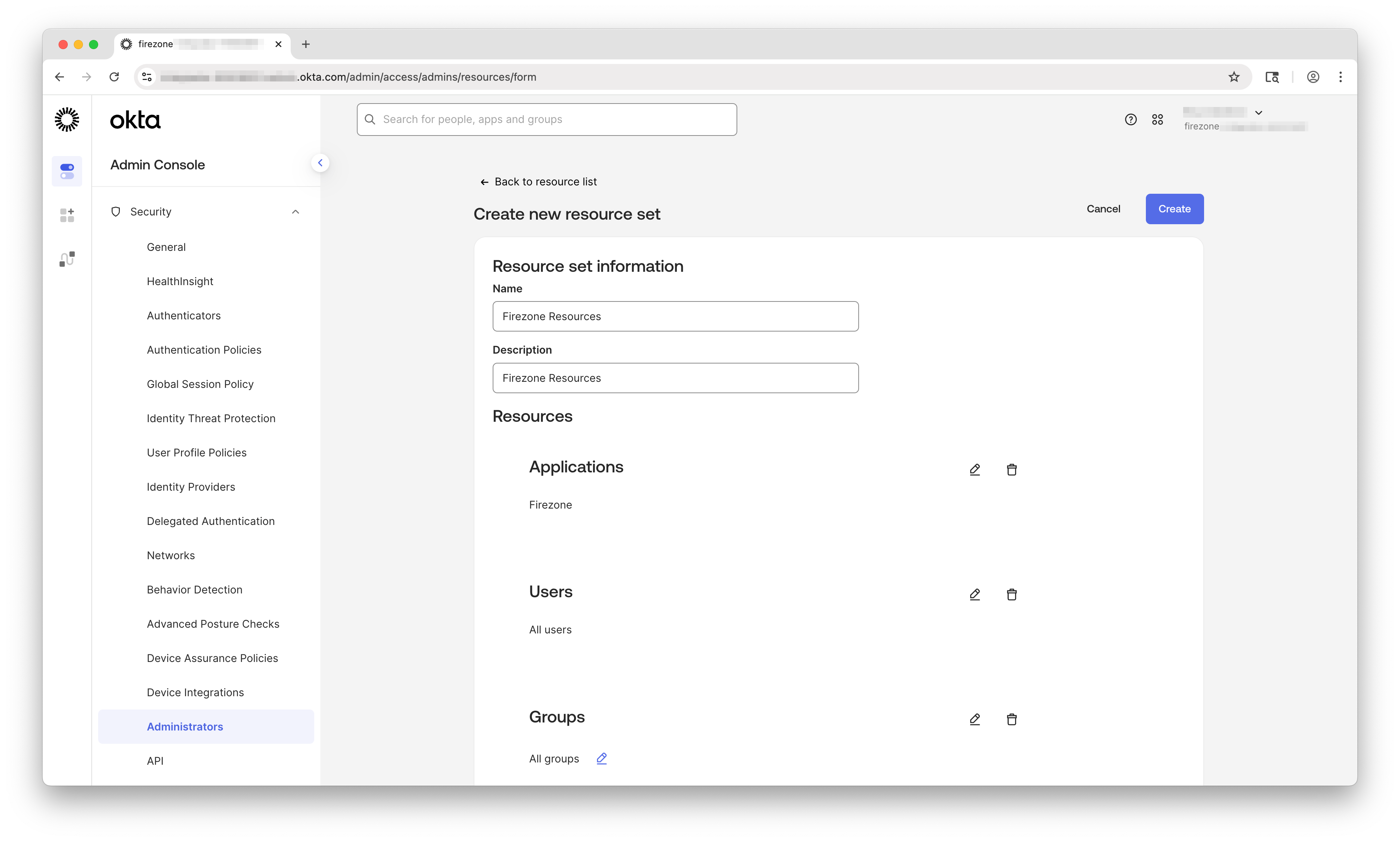 First, create a Resource Set that defines which Okta resources the Firezone API service app can access.