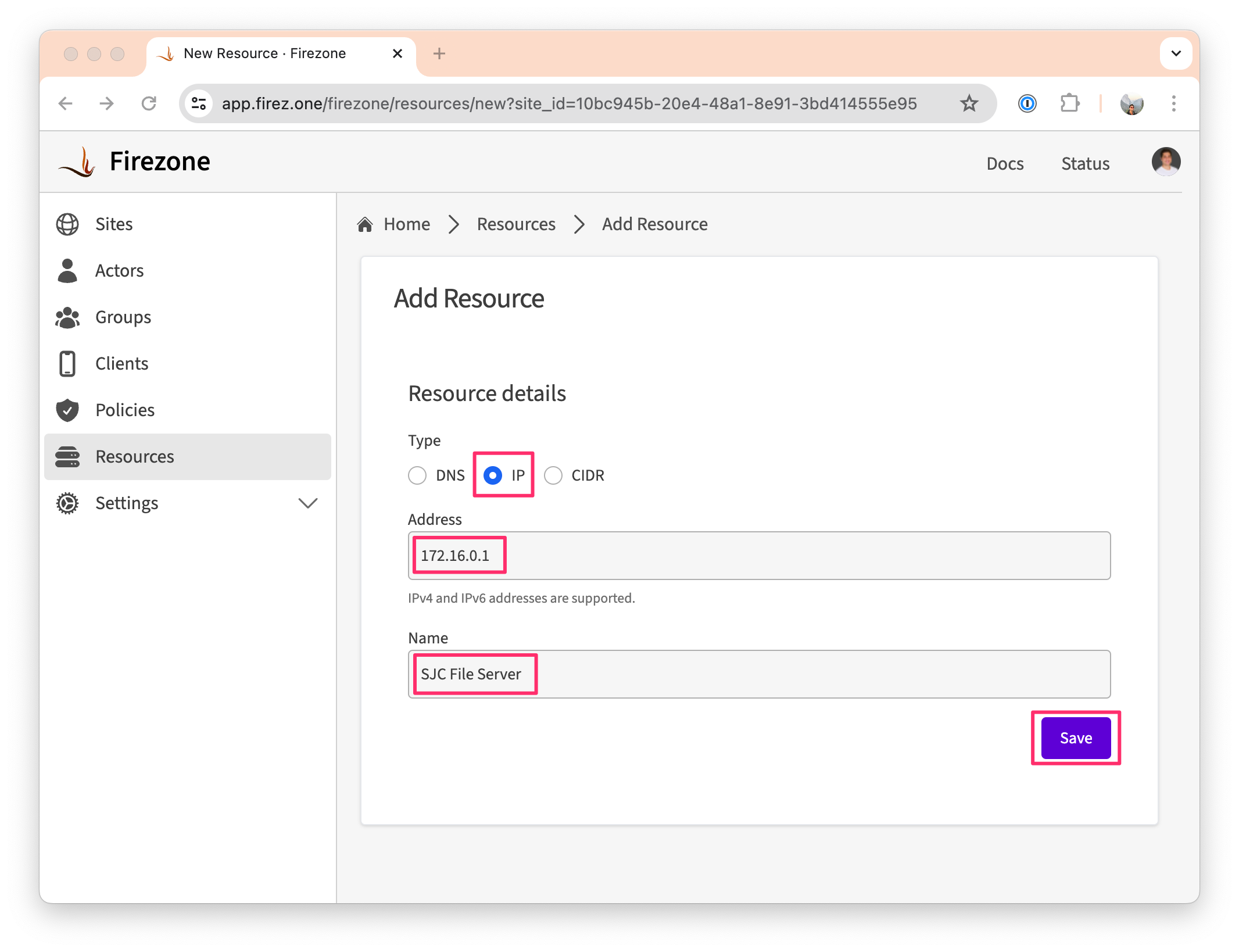 IPas the Resource type. - Enter the private IP address of the host you want to secure access to. This should be an IP that's directly reachable from the Gateway(s) in your Site.