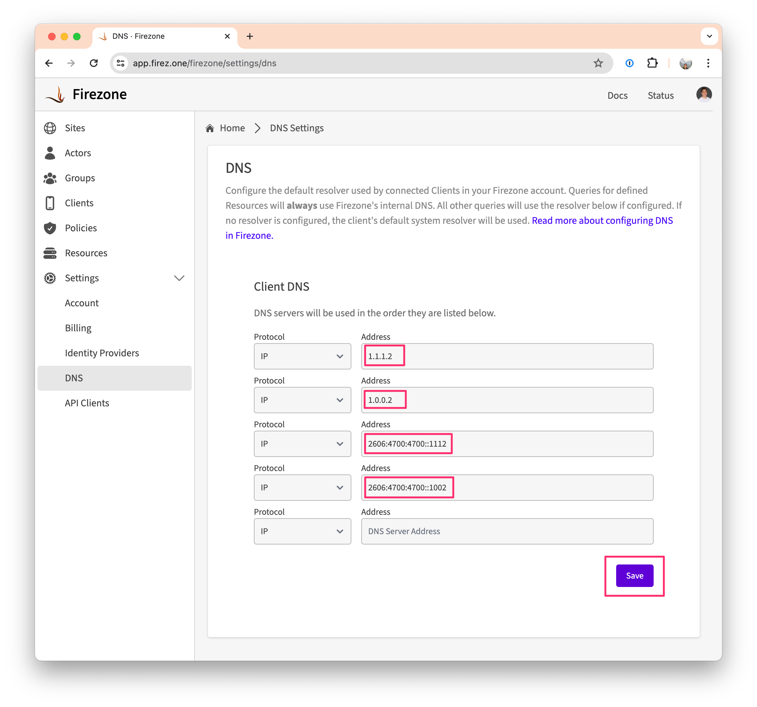 3. Click Save to apply the changes. The Firezone Clients will automatically update their configuration to use the new DNS resolvers.